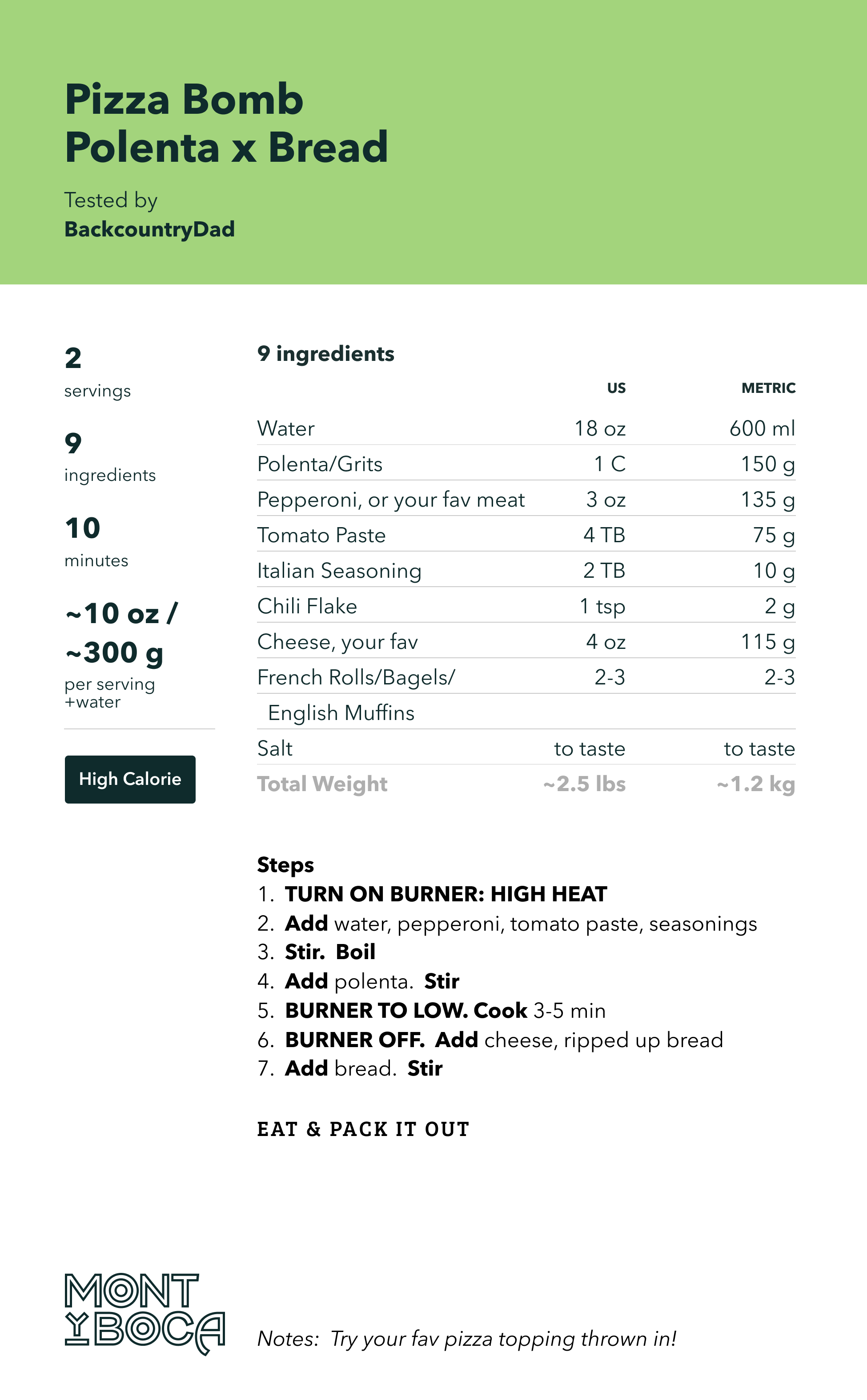 Looking for a high calorie backpacker meal? Look no further with this mash up of bread and grits with your favorite pizza flavors.